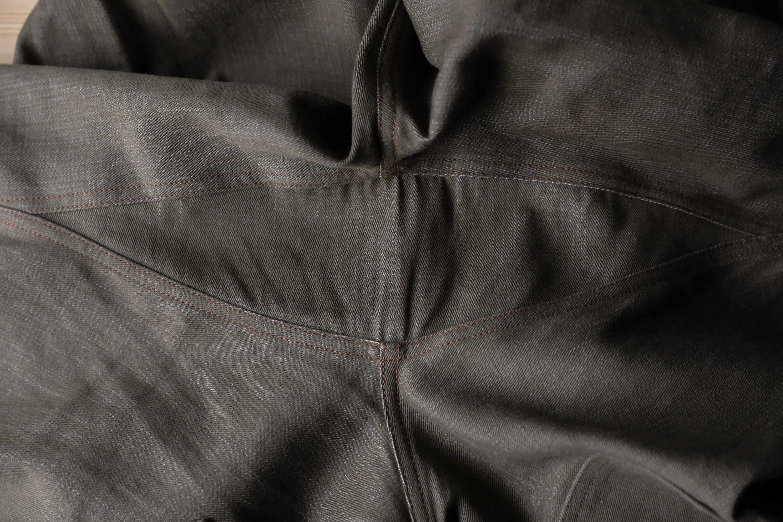 The fly construction is a one piece button fly, a technique patented by David Neustadter in 1877 for jeans construction, making the fly more durable, although it was ignored by factories due to its inconvenience for fast production. When I learned about this technique, I couldn't find a current application of it. Until I came across Paul Kruize (paulkruize.com , a bespoke tailor with a focus on denim), who has recently popularized this technique, sharing his methods and incredible works online. Now, this fly construction method is being reintroduced by individual makers. As a singular piece of fabric, the one piece fly offers a more durable and cleaner substitute to the traditional fly construction. back cinch